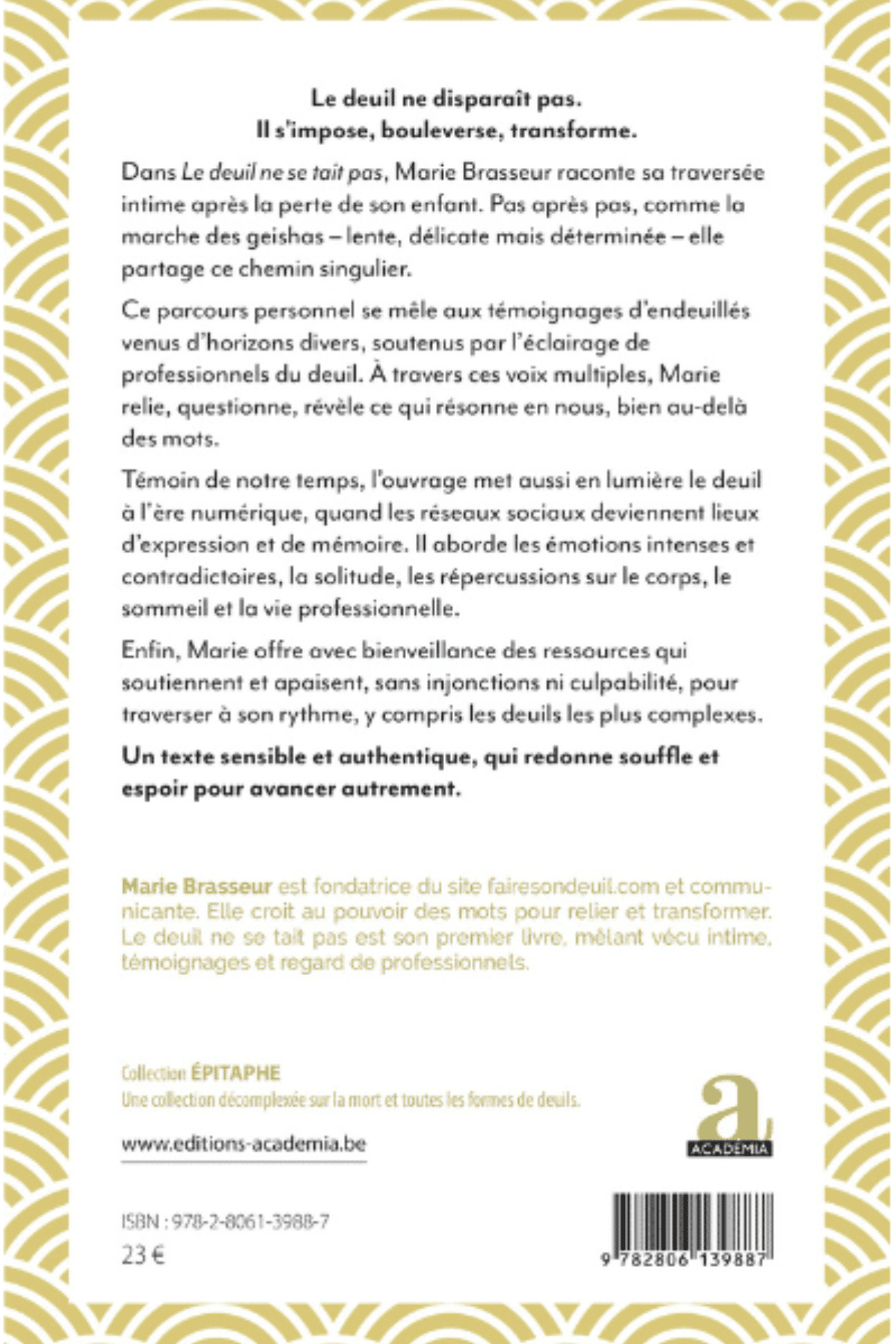 Dans Le deuil ne se tait pas, du chemin intérieur au partage numérique, Marie Brasseur raconte sa traversée intime après la perte de son deuxième enfant. Pas après pas, comme la marche des geishas – lente, délicate mais déterminée – elle partage ce chemin singulier, mêlé aux témoignages d’endeuillés venus d’horizons divers et soutenus par l’éclairage de professionnels du deuil. À travers ces voix multiples, Marie relie, questionne, révèle ce qui résonne en nous, bien au-delà des mots.